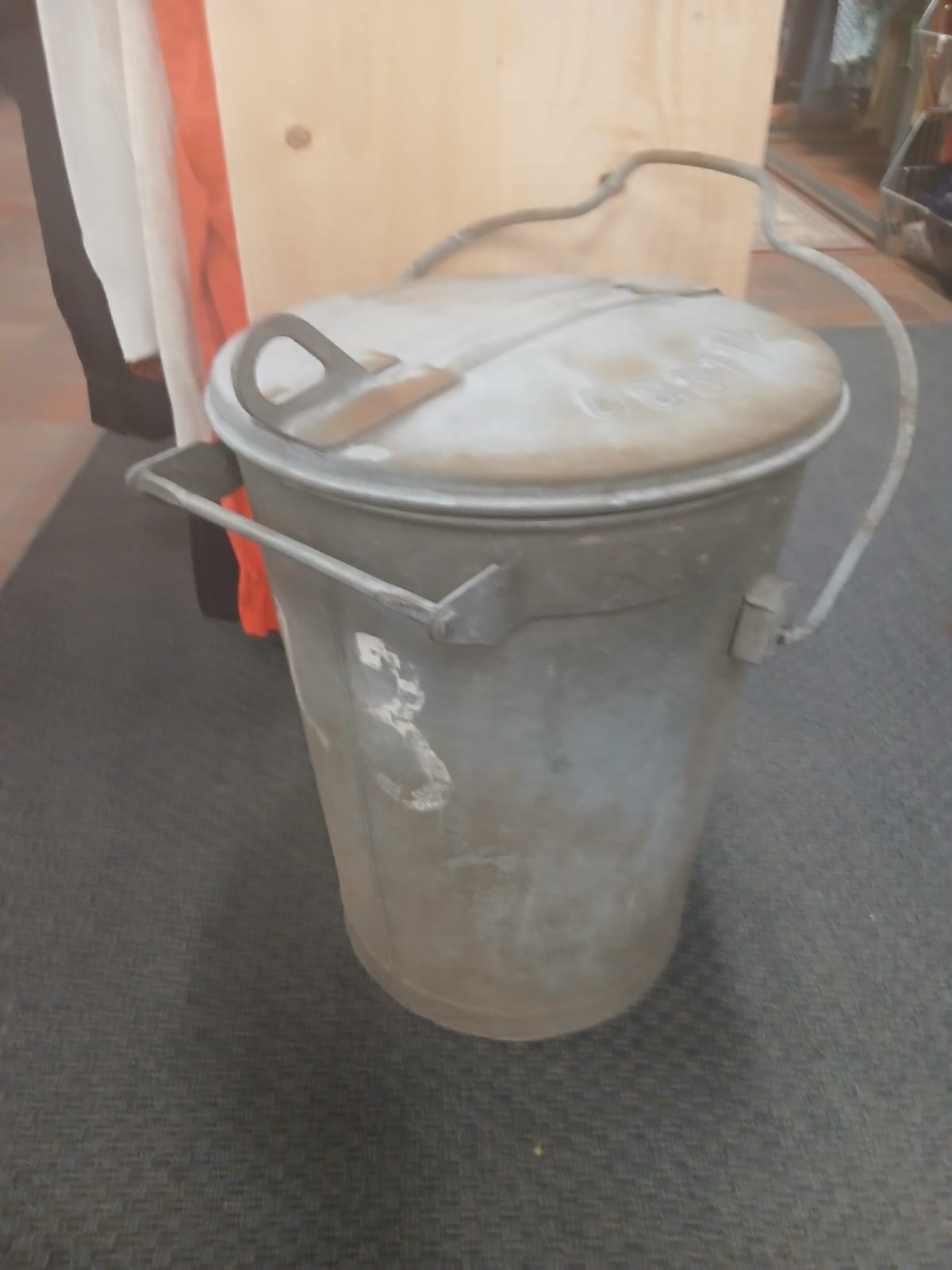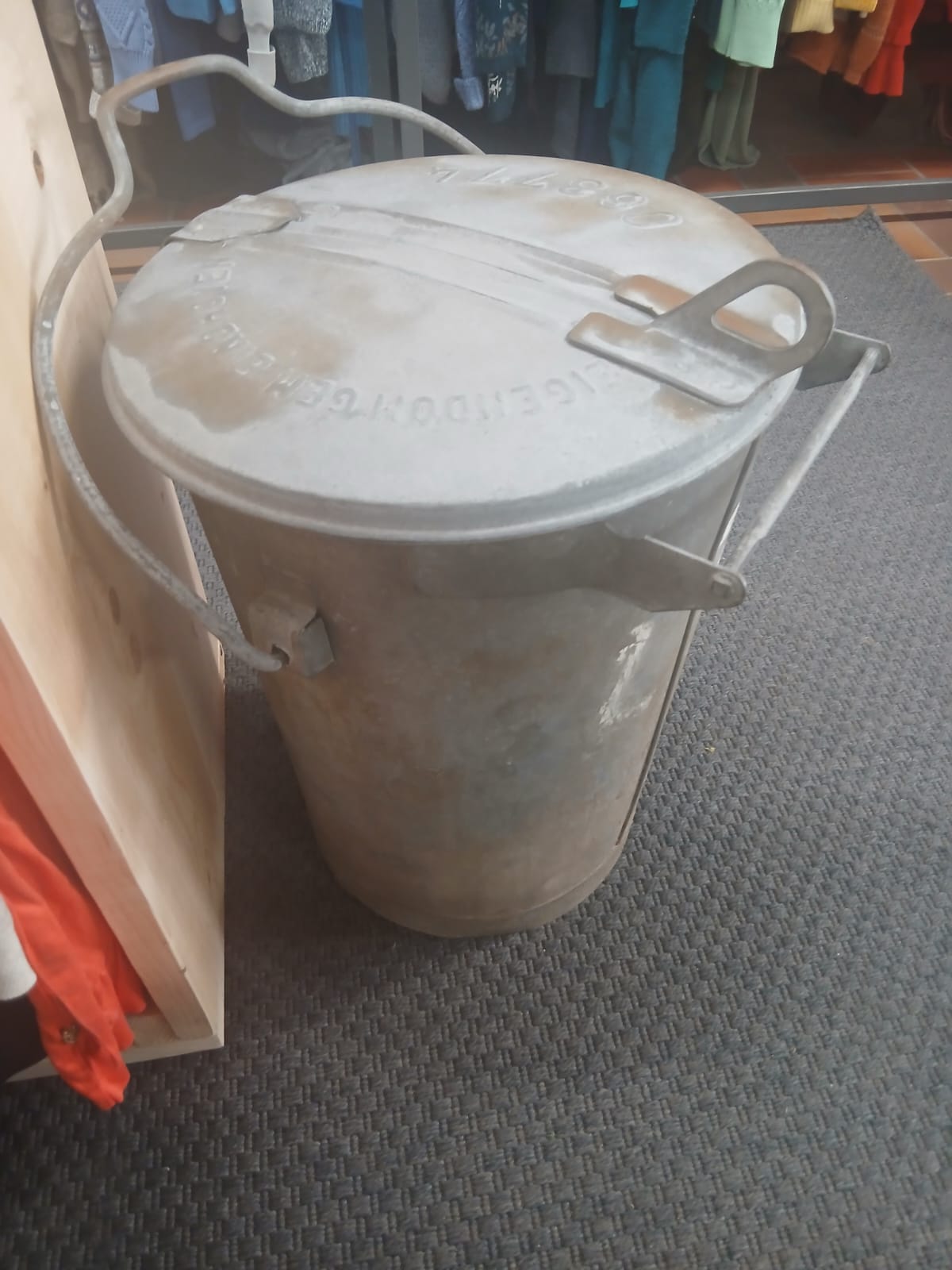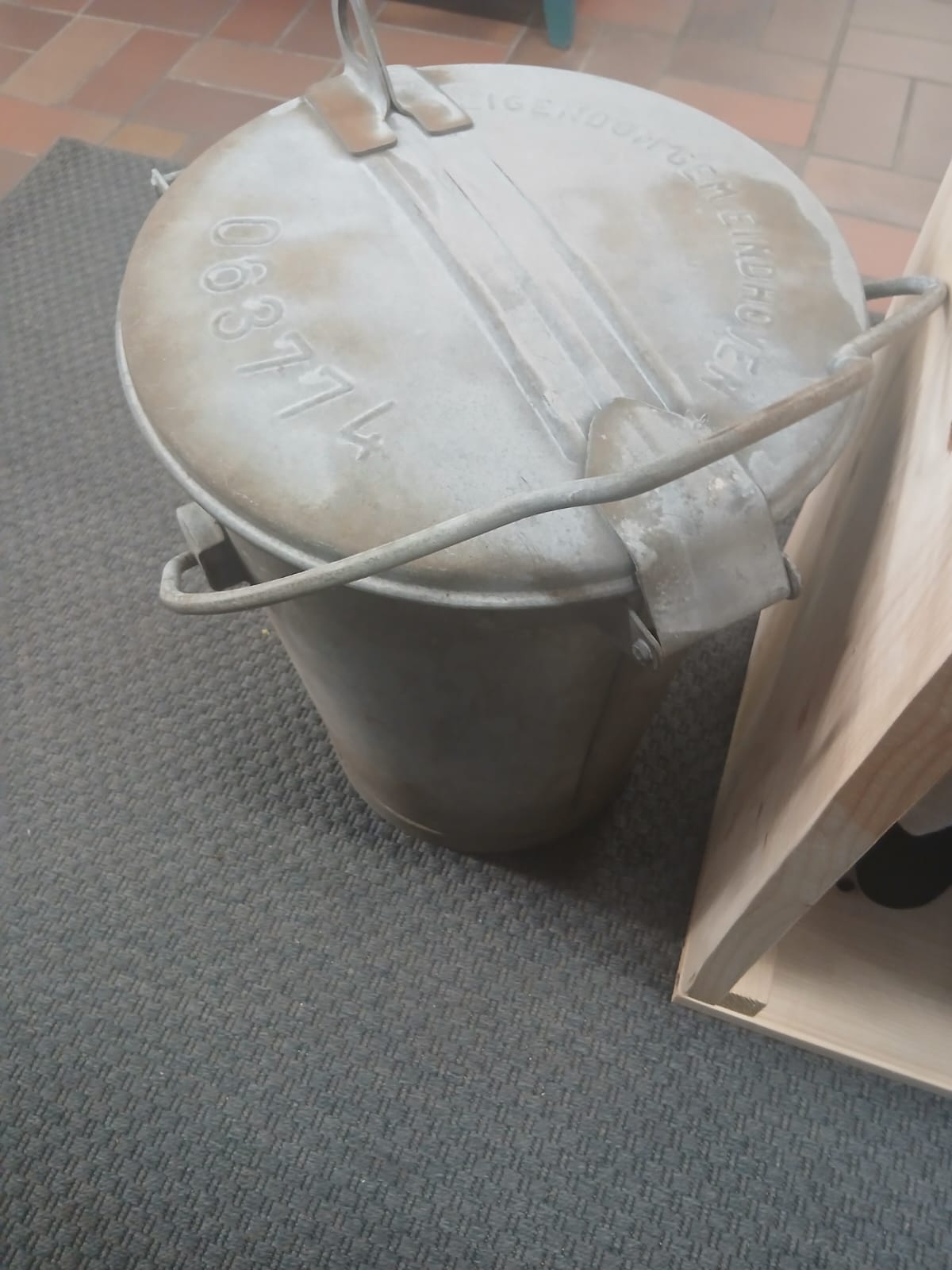 Oude zinken vuilnis- of asemmer met opschrift: gemeente Eindhoven nummer 063774