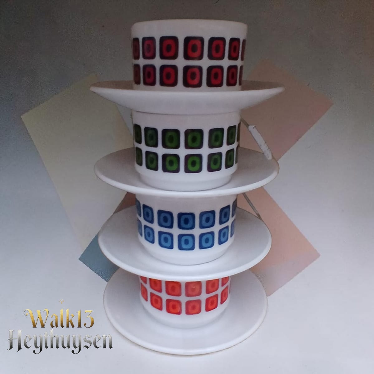 4 square kop en schotels Arcopal 4 kop en schotels met het square decor gemerkt Arcopal France. 1 groene, 1 blauwe en 1 oranje en bordeaux rood