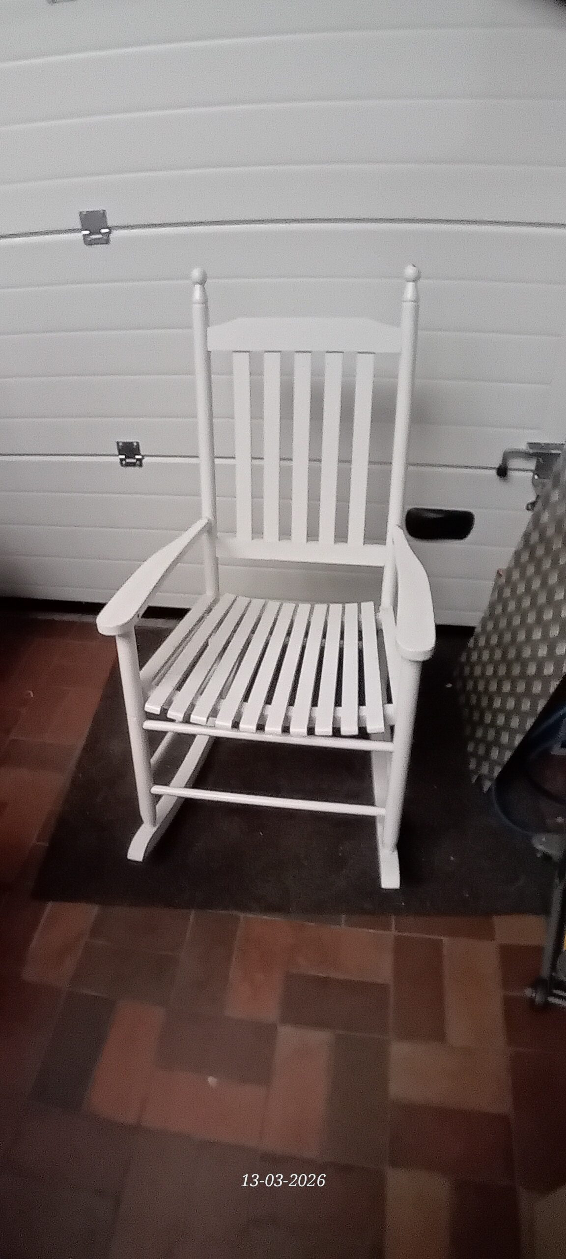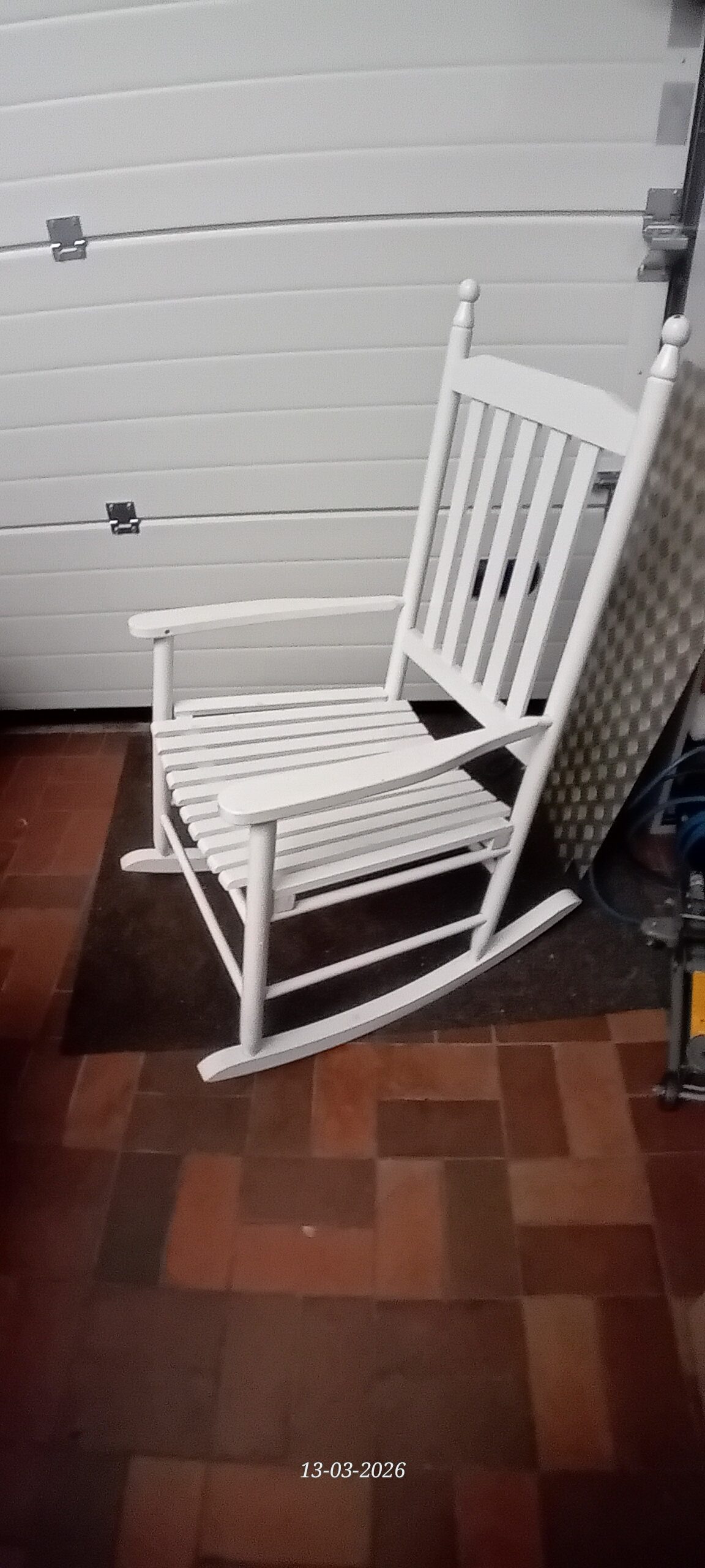 De witte houten schommelstoel op de afbeelding is een klassiek model dat vaak wordt omschreven als een vintage-geïnspireerde of landelijke schommelstoel. Dit specifieke ontwerp is breed verkrijgbaar onder verschillende merknamen en via diverse winkels, zowel nieuw als tweedehands.